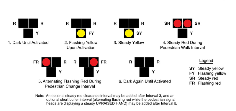 Following an actuation by a pedestrian, a pedestrian hybrid beacon face shall display a flashing CIRCULAR YELLOW signal indication, followed by a steady CIRCULAR YELLOW signal indication, followed by both steady CIRCULAR RED signal indications during the pedestrian walk interval, followed by alternating flashing CIRCULAR RED signal indications during the pedestrian change interval (see Figure 902.10.2). Upon termination of the pedestrian change interval, the pedestrian hybrid beacon faces shall revert to a dark (not illuminated) condition.