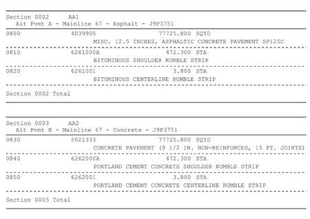 • Using the "Bidtabs.net" program, the quantities for pavement and other items associated only with the asphalt alternate (designated as "Alternate A") should be designated as "Section 02" and the quantities for pavement and other items associated only with the concrete alternate (designated as "Alternate B") should be designated "Section 03". For A2 shoulders or thicker use "Section 04" for the shoulder type that corresponds with "Section 02" and "Section 05" for the shoulder type that corresponds with "Section 03". This will enable summation of the appropriate subtotals to compile an estimated total cost per alternate. If the project had multiple pavement alternates, the 2nd pavement alternate would be “Section 6” and “Section 7”. For shoulder rumble strips, include the bituminous rumble strip pay item with the asphalt alternate, and the concrete rumble strip pay item with the concrete alternate.